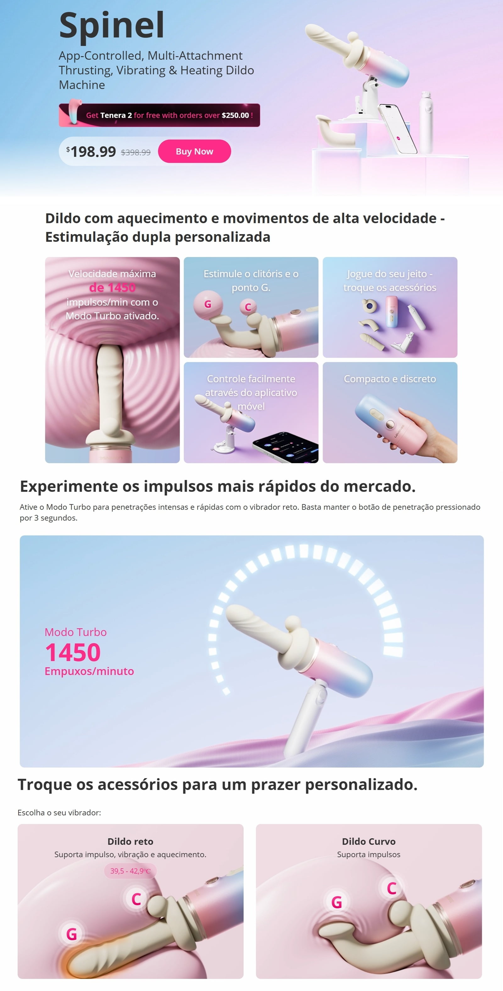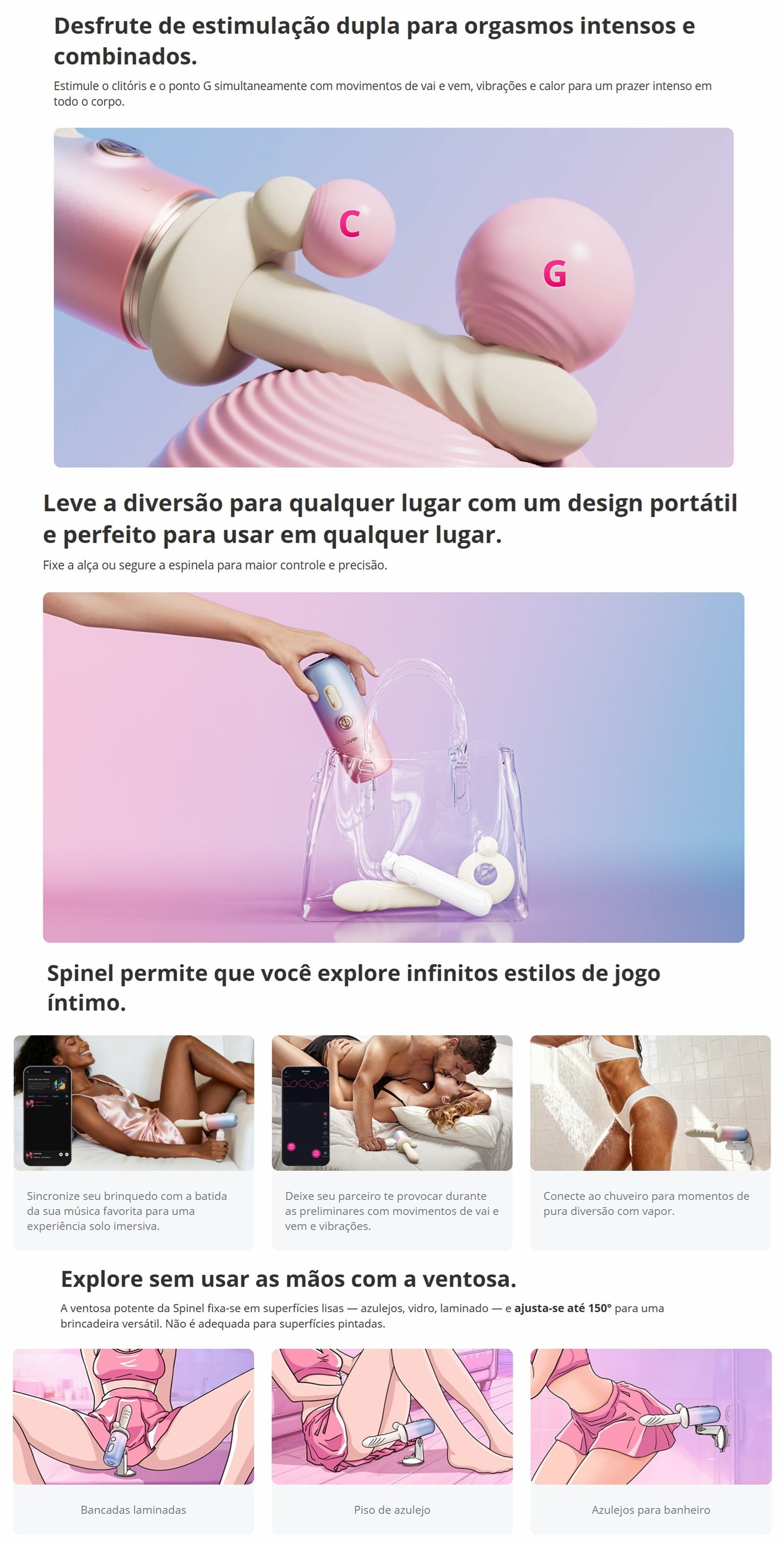 - Funções pelo app: controle total de empuxo, vibração, aquecimento, criação de padrões, controle à distância e integração com plataformas compatíveis.