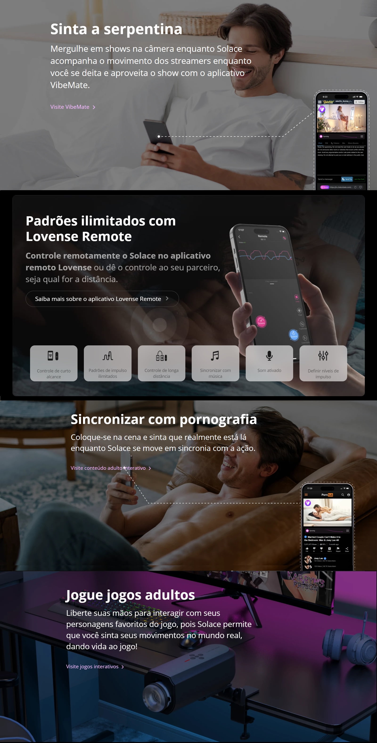 - Integrado ao Chaturbate e outras plataformas de transmissões streaming, o Lovense Solace é bastante usado por Camboys para arrecadar tokens em transmissões streaming como Chaturbate. O som dos tokens recebidos faz o Solace vibrar numa intensidade ainda maior! Use o Solace e ganhe muito dinheiro nas plataformas de sex streaming.