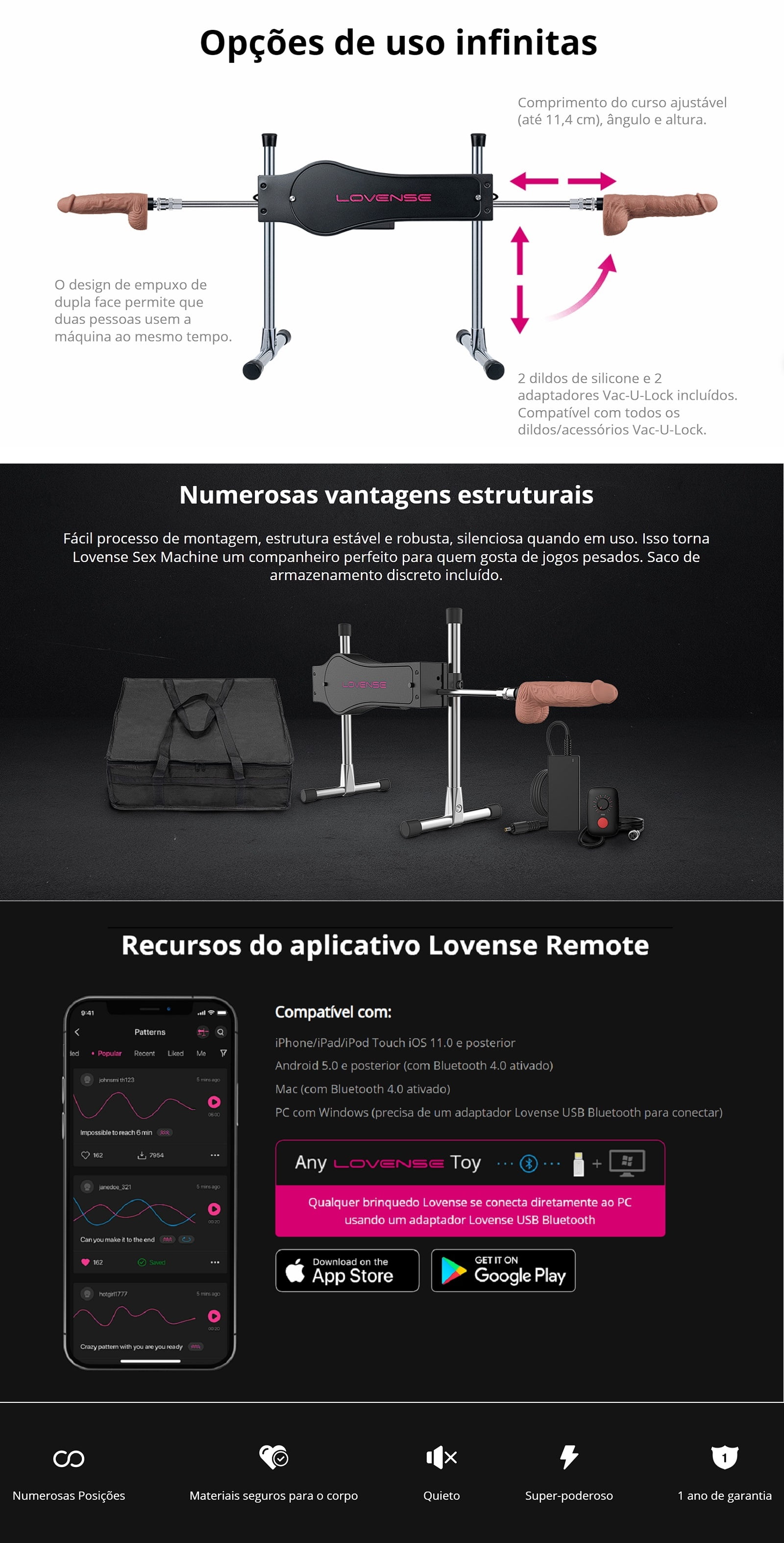 > Composição: Dildos são feitos de silicone e a máquina é feita de metal.